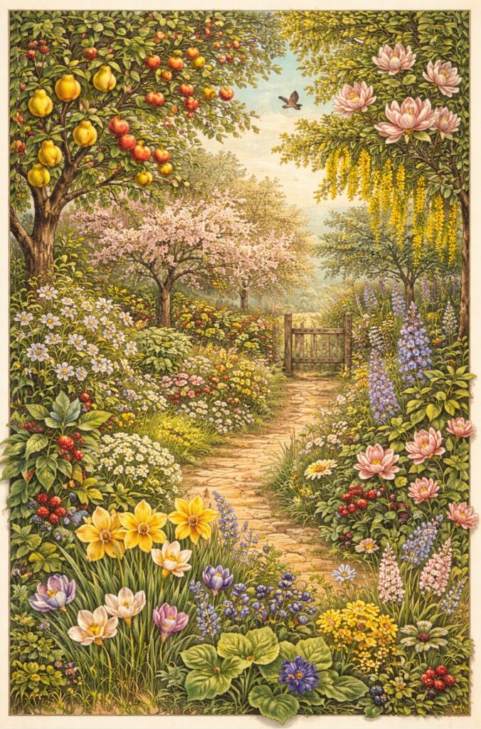 Kinderstemmen die ritmisch allerlei planten- en bomennamen (in het Engels) opnoemen: Crocus, narcissus, fritillary, primula veris, jasmine, japonica, walnut, sweet chestnut.